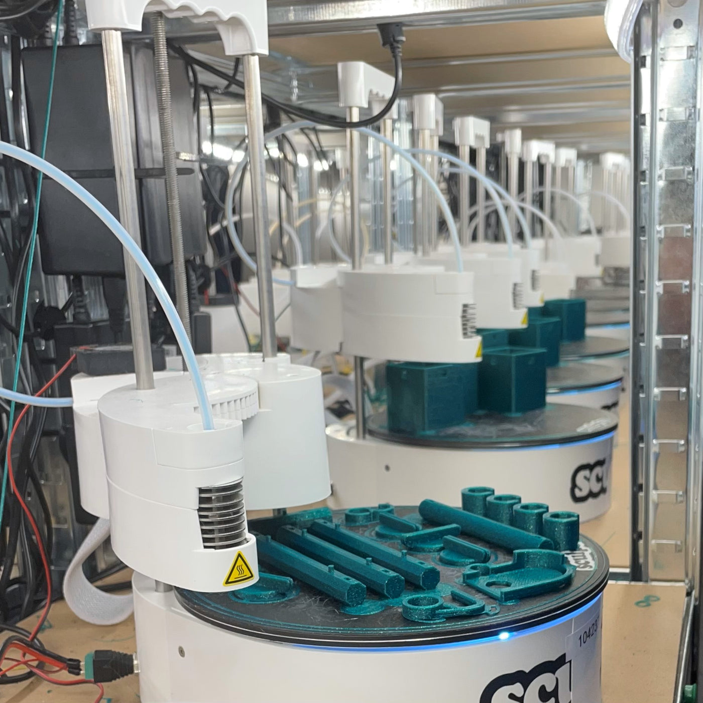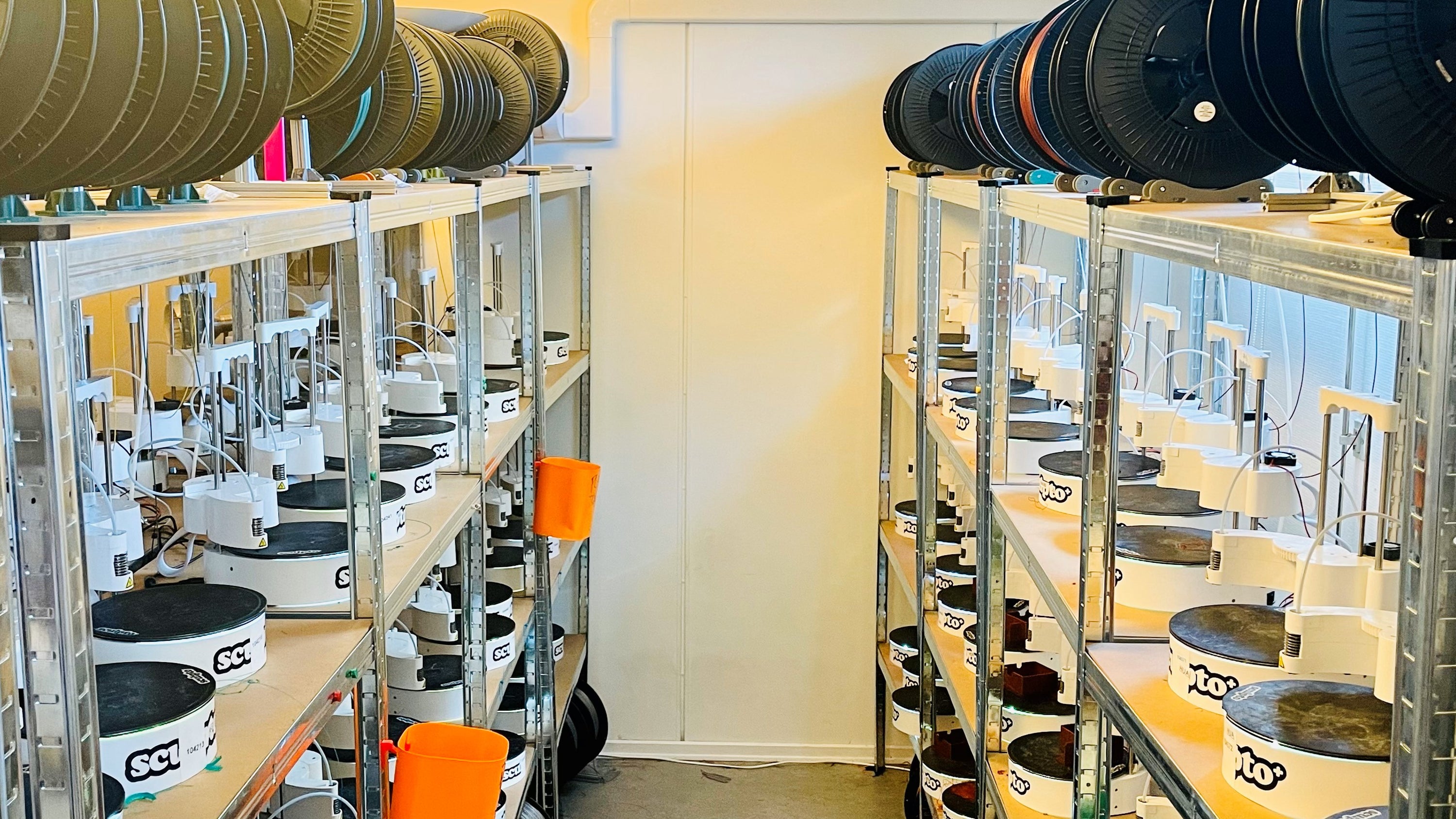 Vores printfarm med mere end 200 printere (Og der kommer løbende flere til) - det betyder at vi kan producere mange tusind emner om ugen. Hvor mange styks vi kan producere, af dit produkt afhænger af størrelsen og kompleksiteten på produktet.
